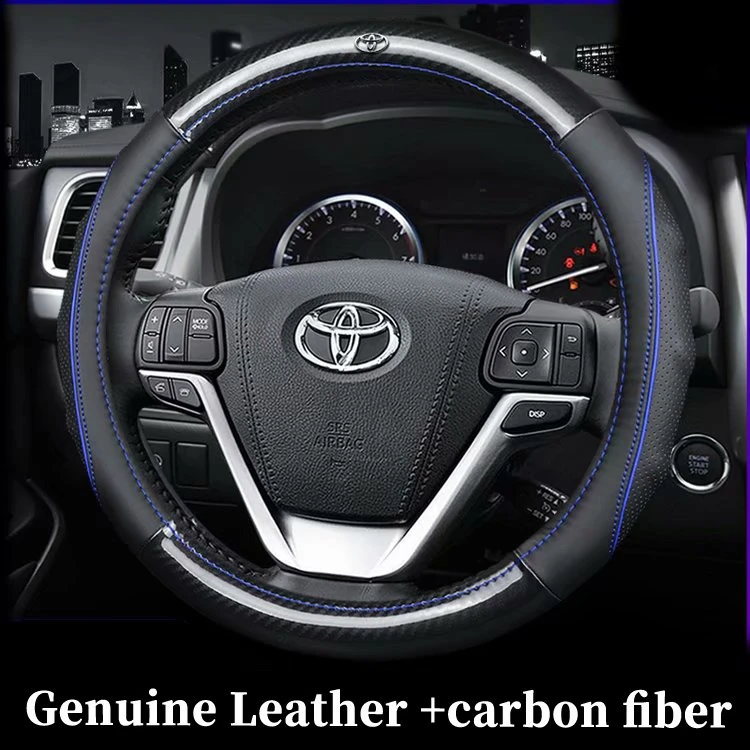 For Toyota Carbon Fiber Cow Leather Car Steering Wheel Cover For Toyota Reiz Hilux Hiace Fortuner Corolla Innova Camry Highlander Fj Crusier Vitz Car Accessories Interior Universal Genuine Leather Steering Wheel Cover